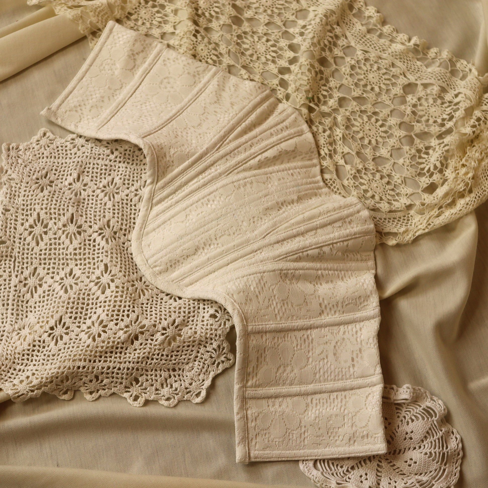 Les corsets sont fabriqués à partir de coupons de tissus que je chine, récupère avec soin.