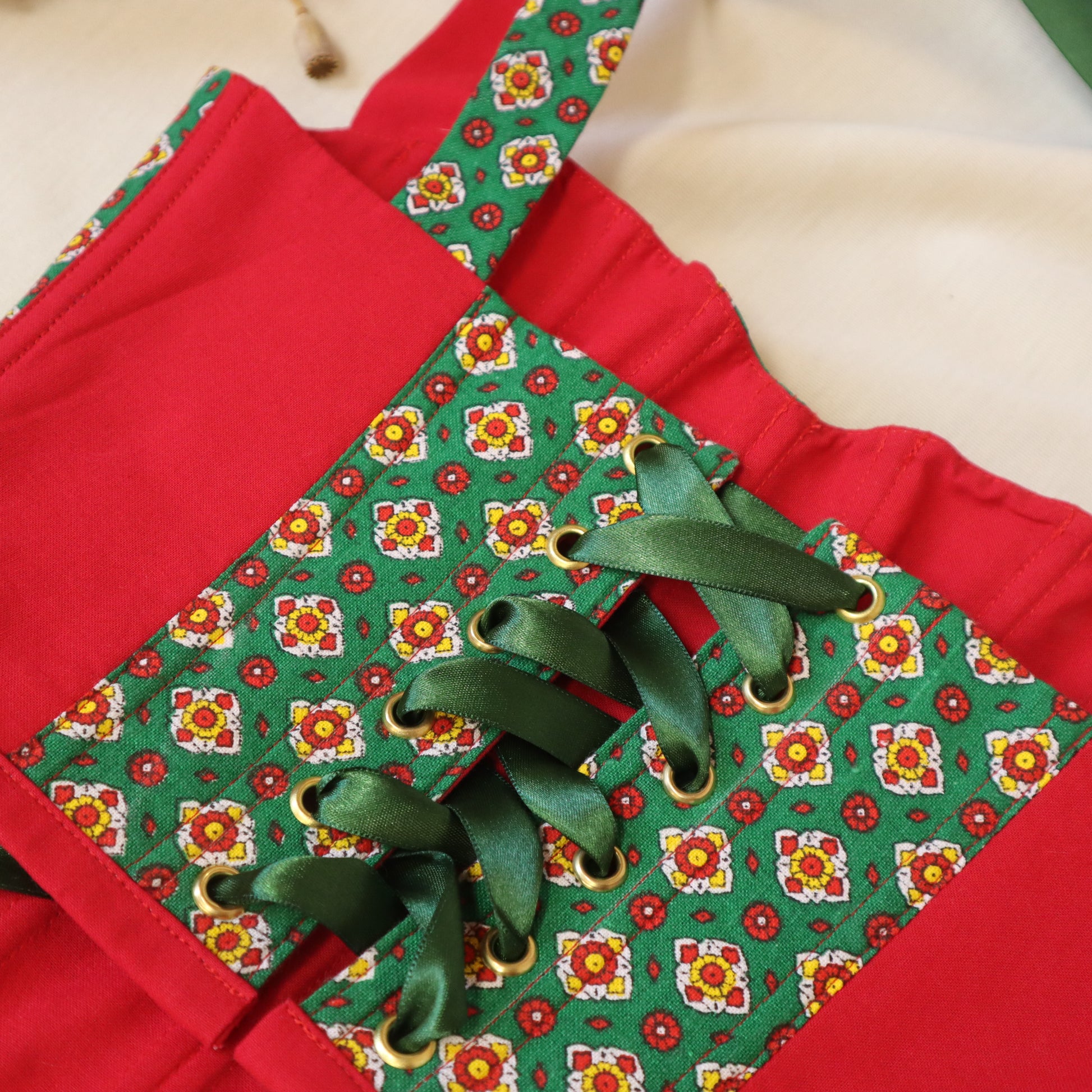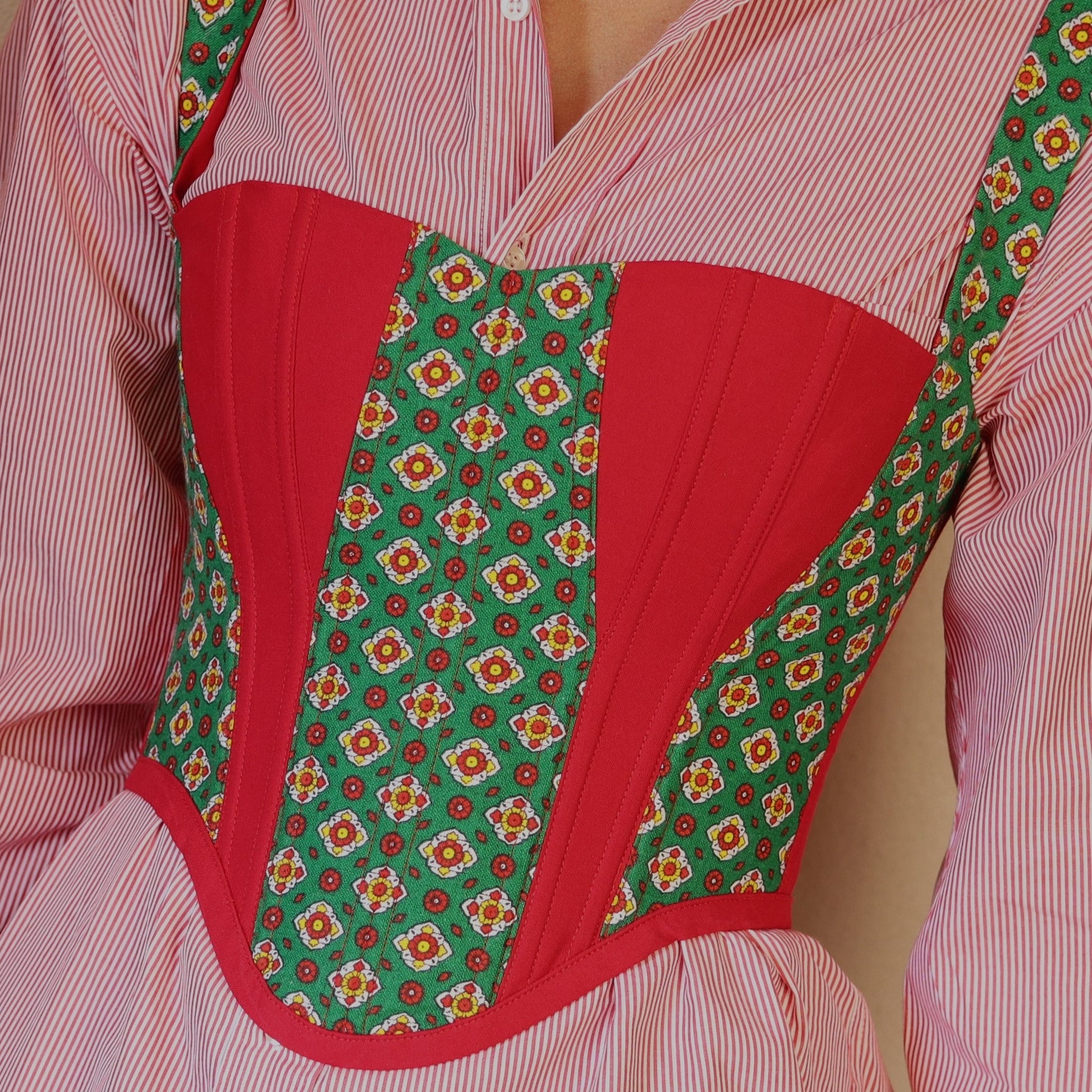 Le motif provençal est alterné avec un tissu uni afin de mettre en valeur les courbes du corset. Les bretelles et le dos se nouent à l'aide d'un ruban satin, le modèle est donc réglable.