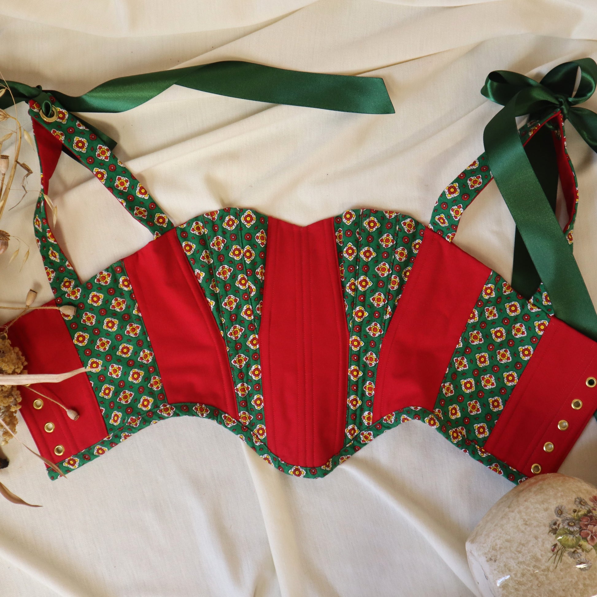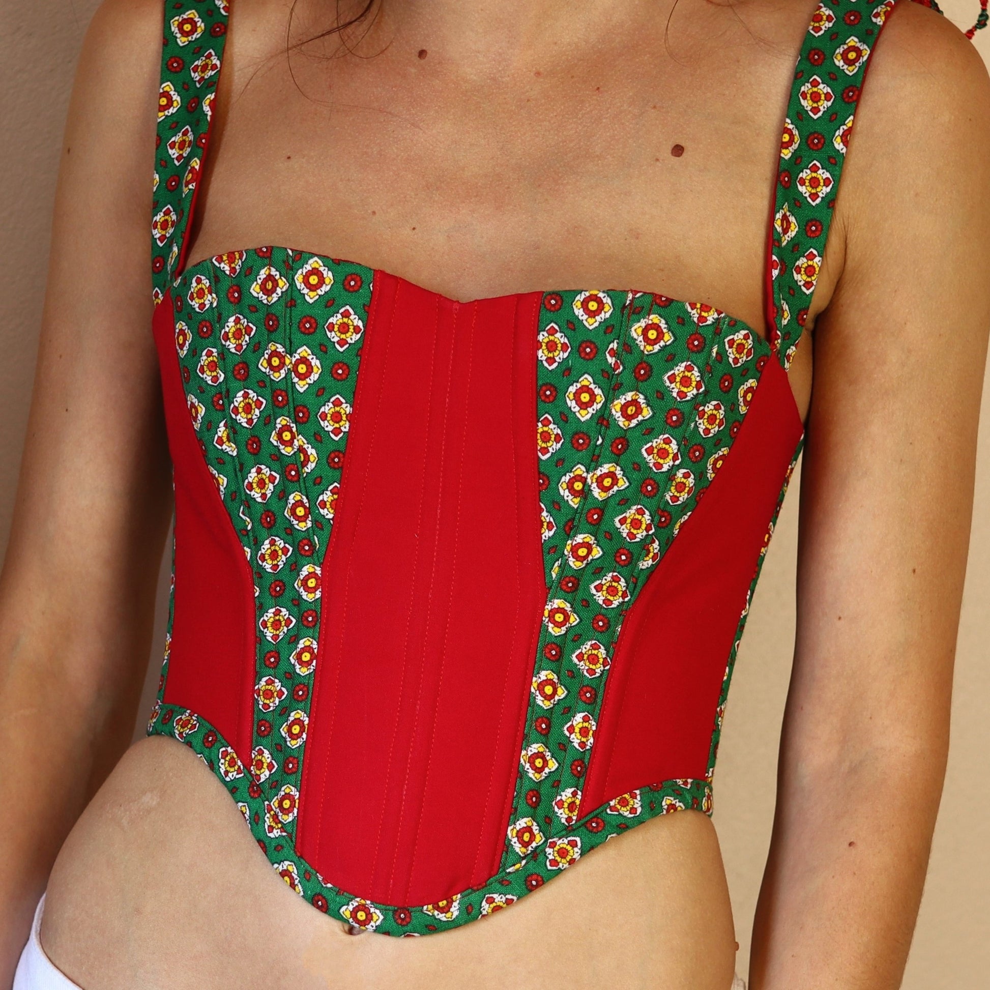 Le motif provençal est alterné avec un tissu uni afin de mettre en valeur les courbes du corset. Les bretelles et le dos se nouent à l'aide d'un ruban satin, le modèle est donc réglable.